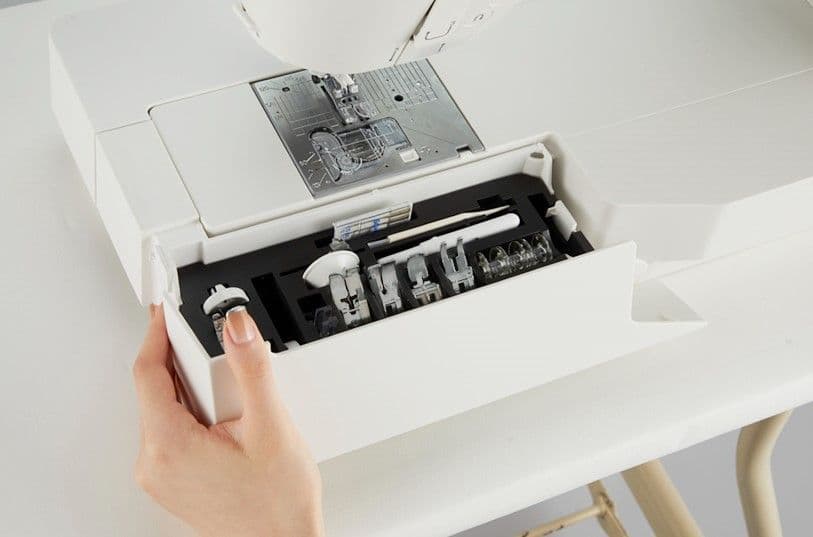 The auxiliary bed with accessory storage is the first among sewing machines with a 12″ workspace. Keep your most often used accessories in their place and at your fingertips.