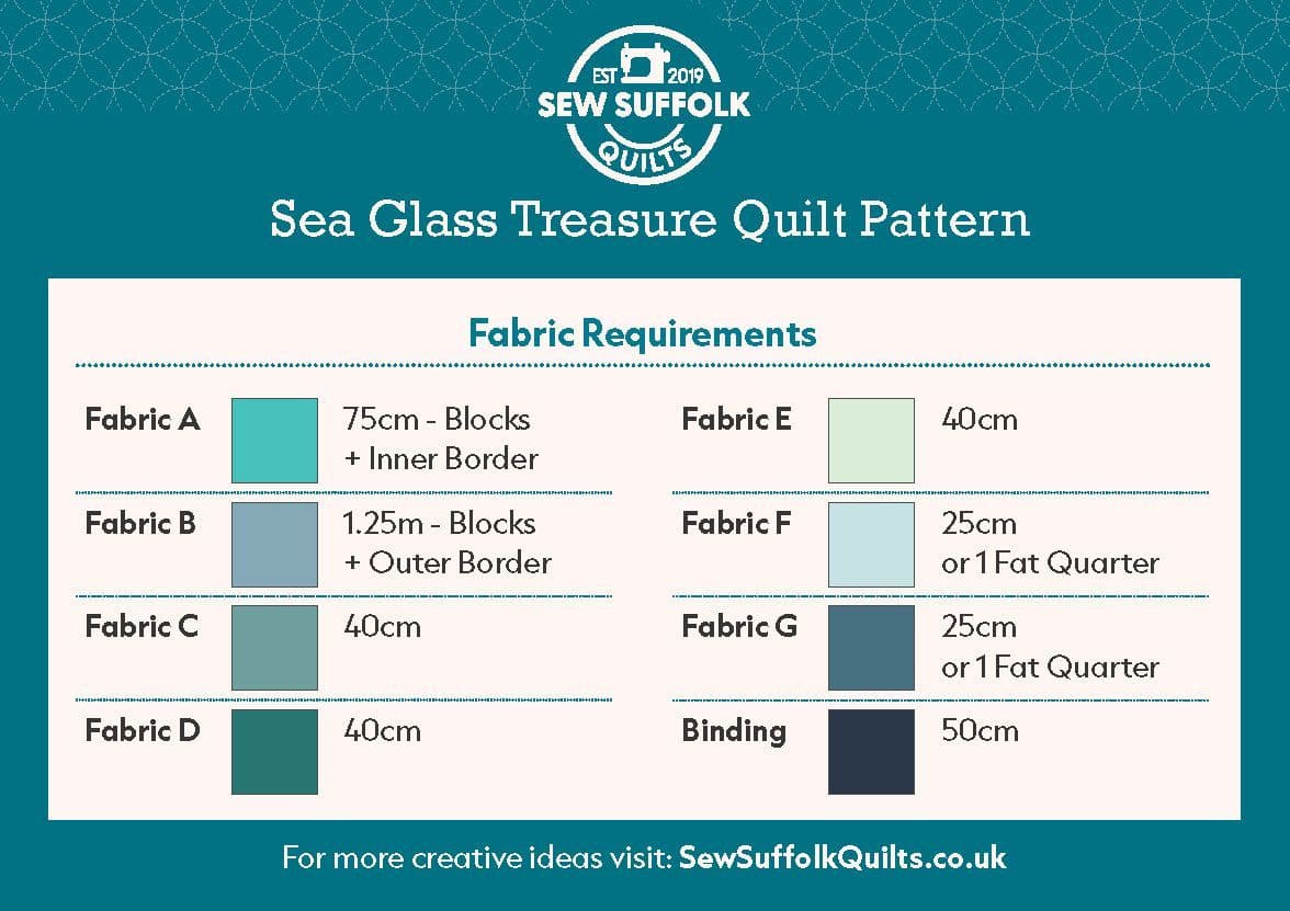 This Sea Glass Treasure Quilt pattern was inspired by the beautiful colours and tumbled shapes of sea glass pebbles found on the beach at Southwold in Suffolk.