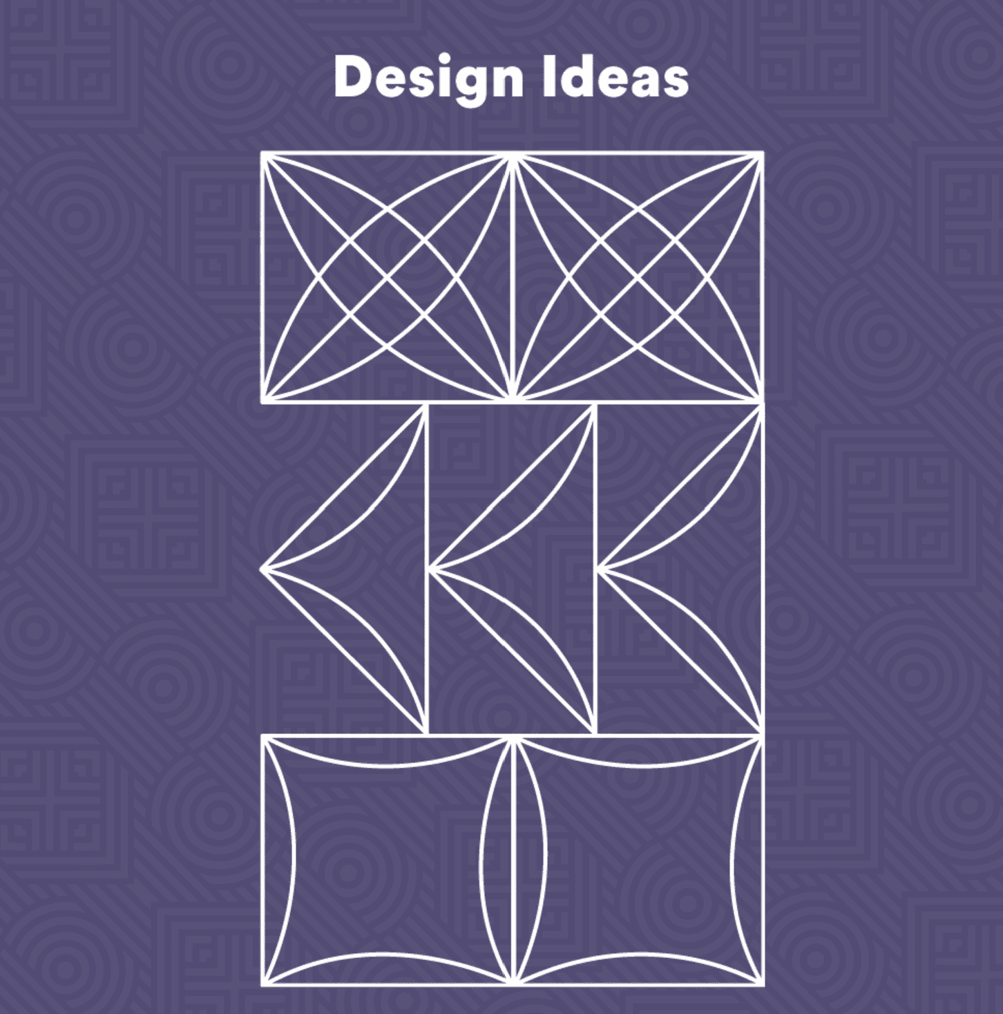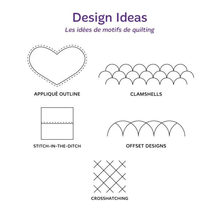 Design uses include: stitch in the ditch, 1/4" outline stitching and crosshatching, right angle cut-out for corners, continuous curve quilting, hopping foot notch and gentle curve for outlining applique, full 4-inch curve for circles and clam shells. Packaging includes instructions for use, safety tips and design ideas.